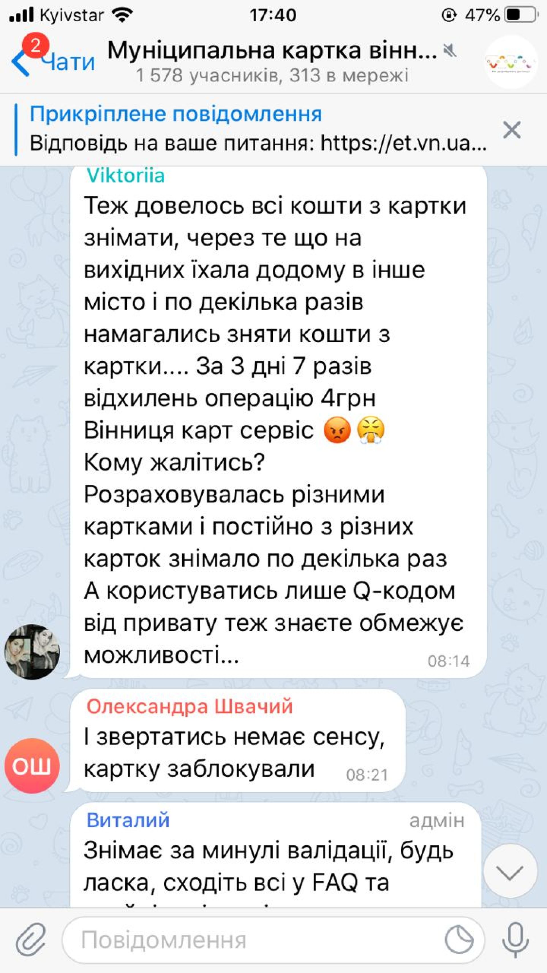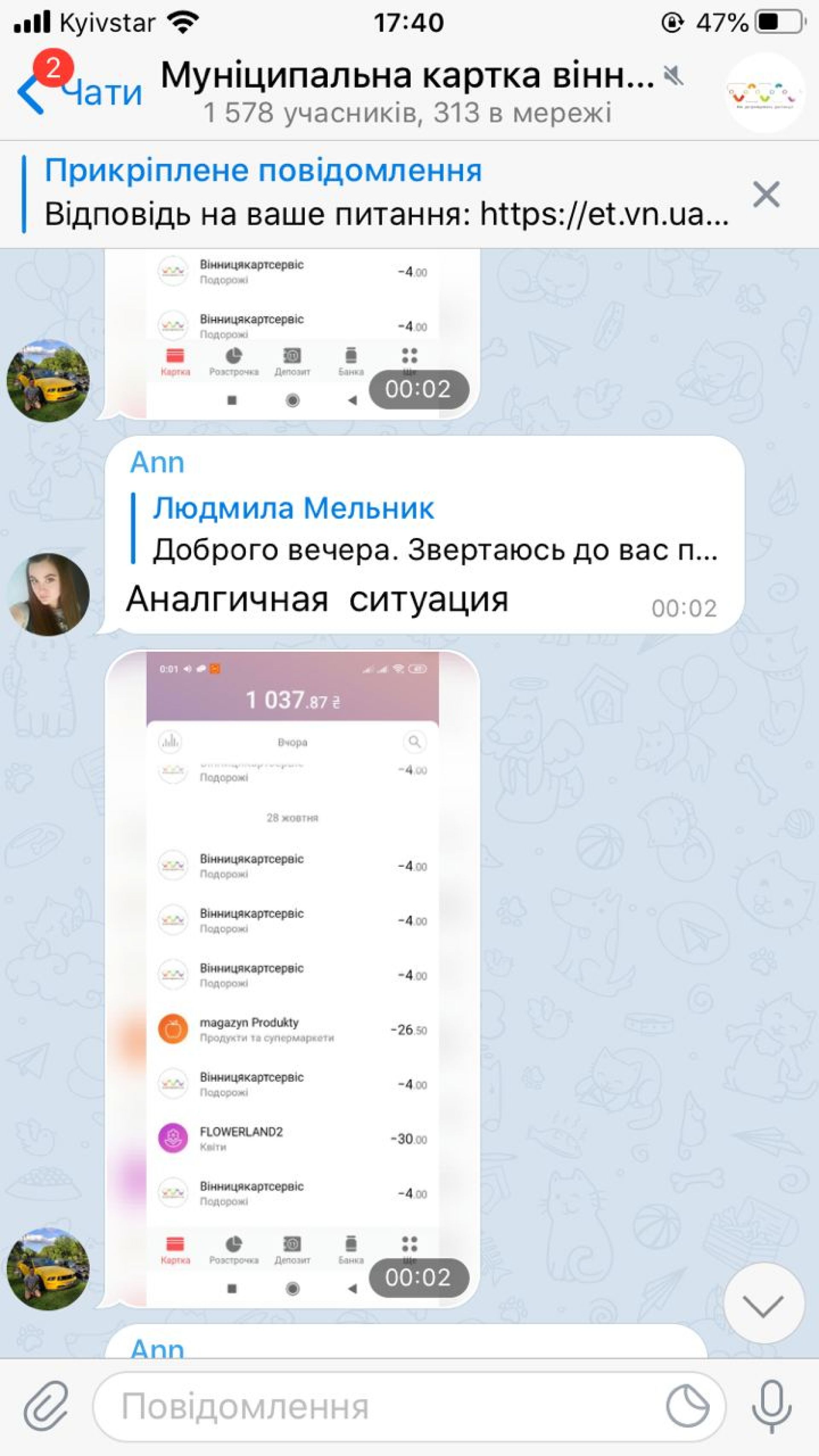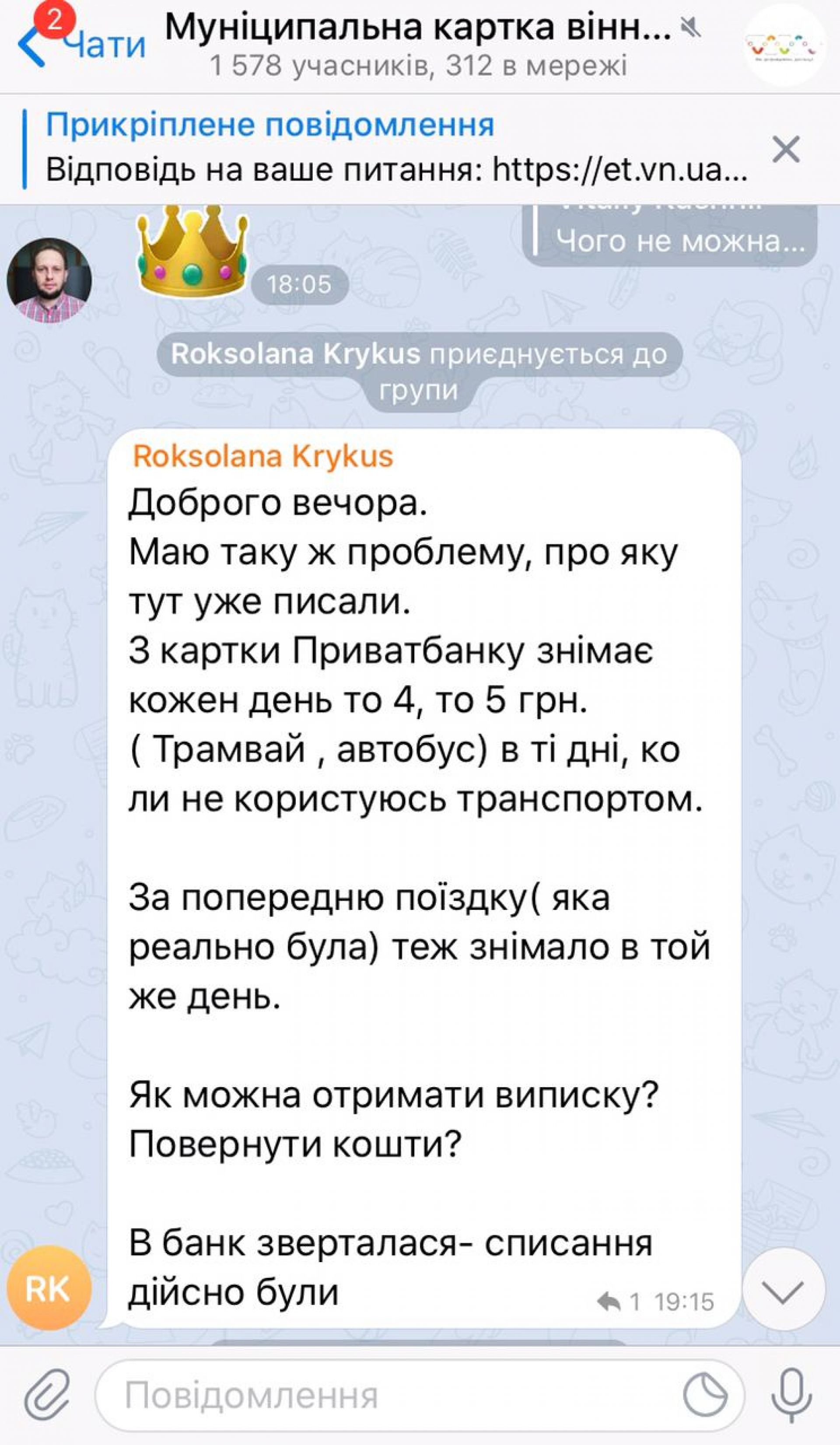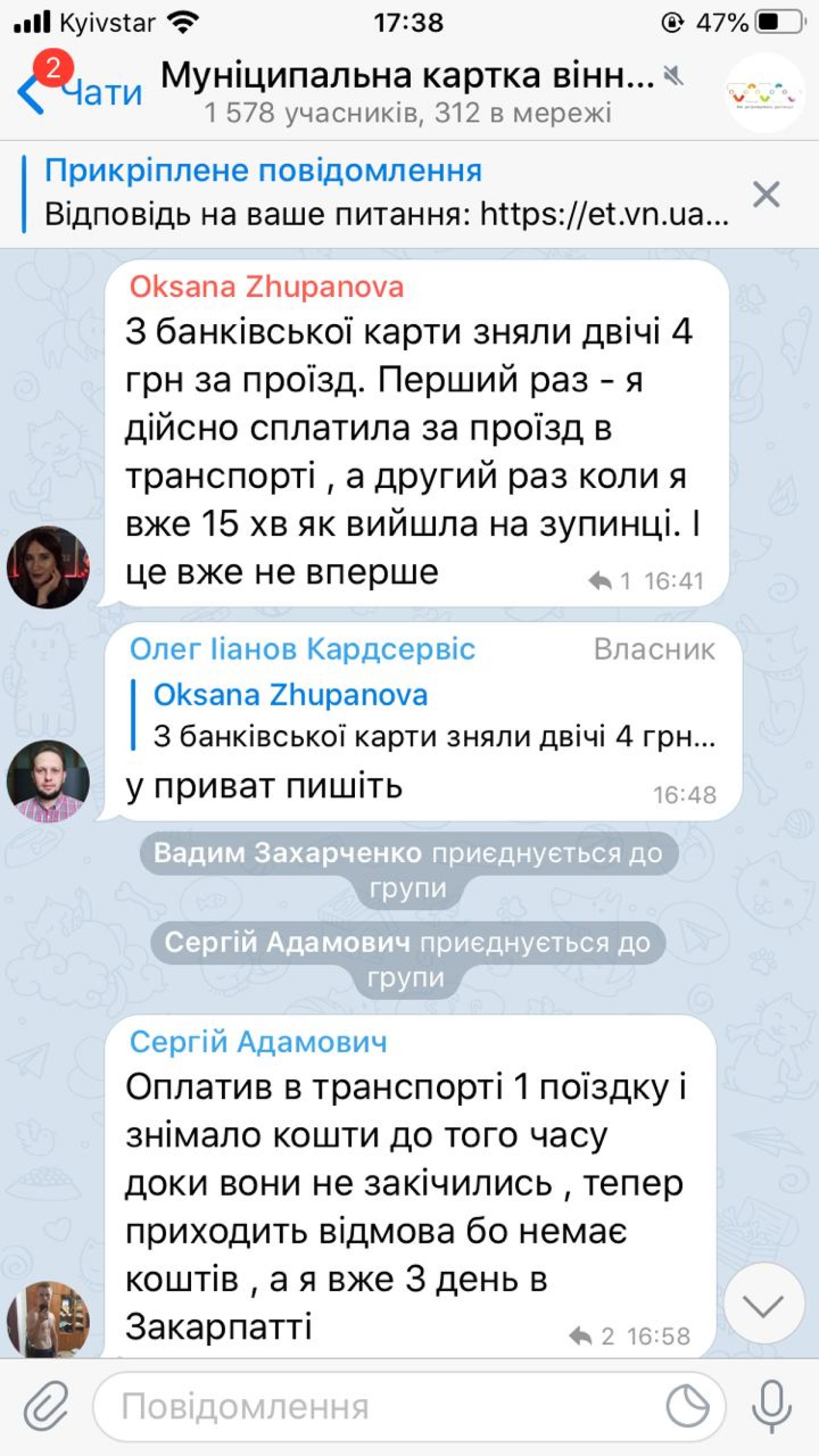 Вінничани в соцмережах скаржаться, що після розрахунку на валідаторах у транспорті в них зняло гроші за декілька поїздок одразу. Крім того, часто це відбувалося вночі, коли міський транспорт не їздить Вінницею. У журналістки «20 хвилин», яка розраховується банківською карткою у громадському транспорті, теж посеред ночі 17 разів зняло гроші за проїзд, хоча вона впродовж цього дня лише двічі користувалася транспортом. Зайшовши в чат технічної підтримки «Вінницякартсервіс» у Телеграмі, ми побачили, що це не одинока проблема. Схожа ситуація виникла у десятків вінничан за крайній тиждень.