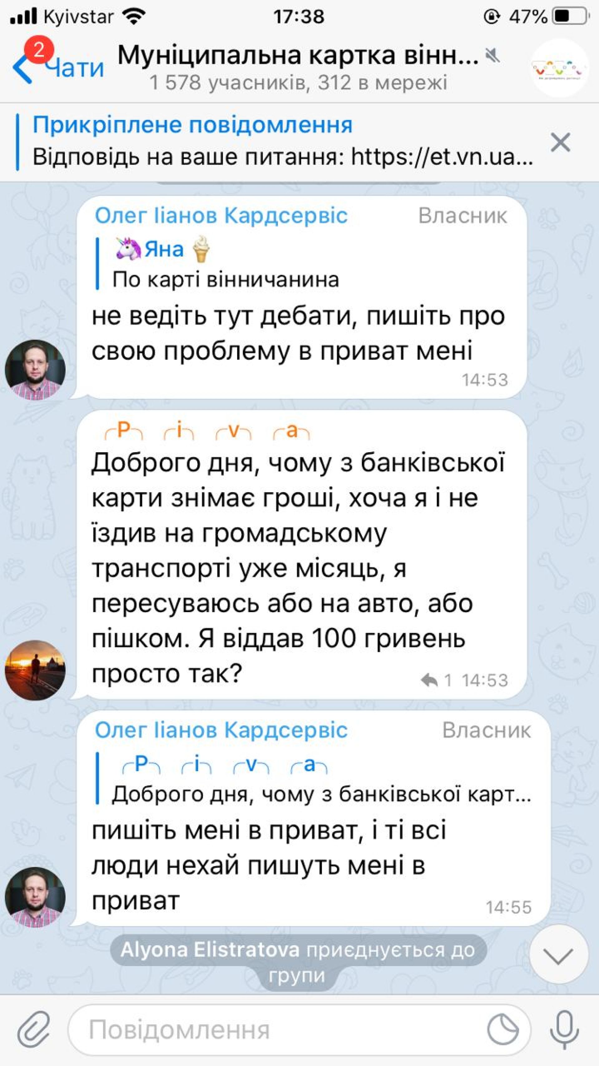 «Їхала в автобусі, розрахувалась карткою, кошти знялись через тиждень, коли вже не було грошей на балансі. А коли гроші з'явилися, то тричі зразу зняло по п'ять гривень. Що робити? Припиніть красти гроші!», — пише вінничанка Анастасія.